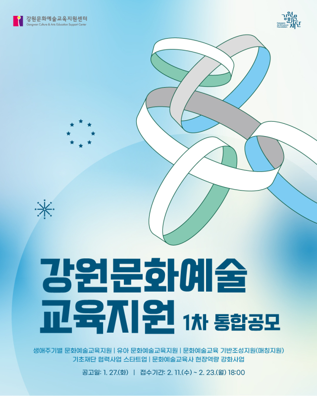 강원문화재단이 다음달 11일부터 23일까지 ‘2026년 강원문화예술교육 지원사업’ 1차 통합 공모에 나선다.