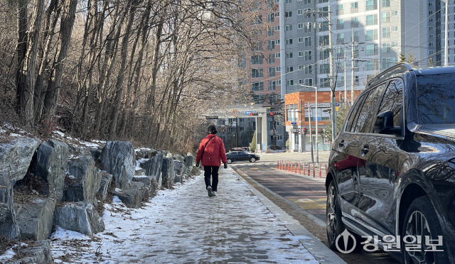 28일 찾은 춘천 동부노인복지관 인근 보행로. 복지관으로 향하는 200여m 구간의 보도블럭이 얼음과 눈으로 꽁꽁 얼어붙어 있었다. 노인들은 종종걸음으로 조심스레 발을 내딛었고, 양팔을 벌린 채 미끄럼 사고를 대비하는 모습도 눈에 띄었다.