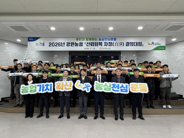 농협중앙회 강원본부(본부장: 김병용)는 28일 농협 강원본부 5층 대회의실에서 신뢰회복 자정(自淨) 결의대회를 열고 대국민 신뢰회복과 임직원 윤리의식 쇄신에 앞장 설 것을 다짐했다.