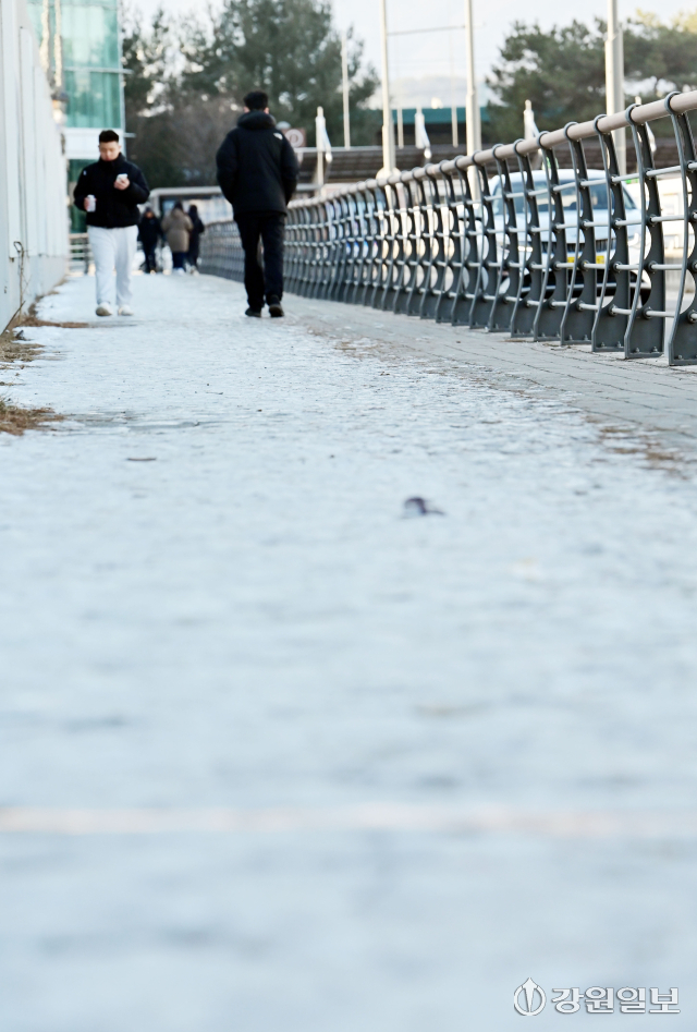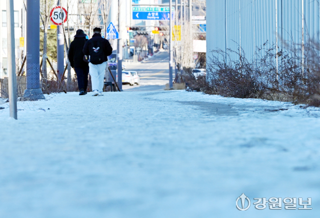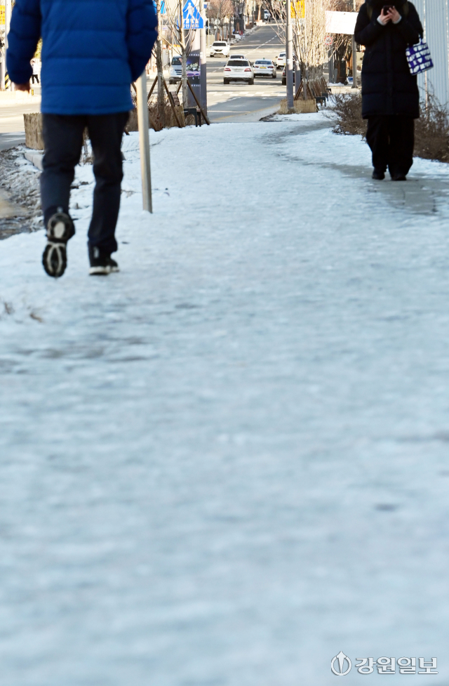 연일 지속된 한파에 빙판길·도로 살얼음으로 인한 사고의 위험이 높아지고 있다. 28일 춘천역 앞 인도가 꽁꽁 얼어있어 보행자의 안전이 위협받고 있다.