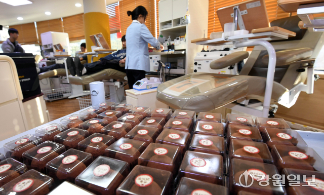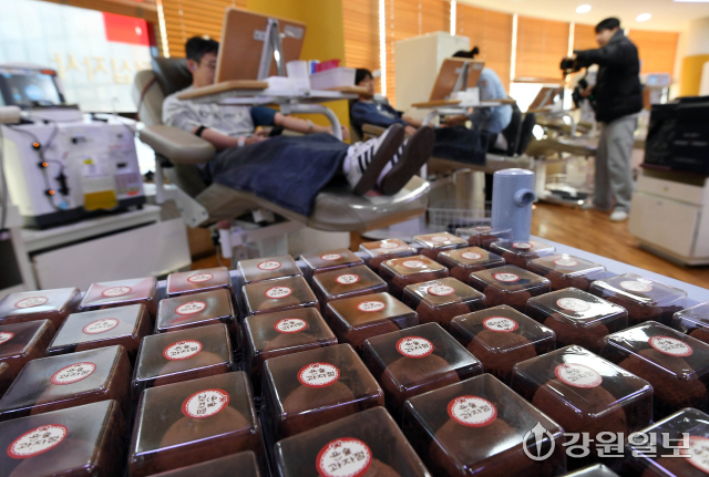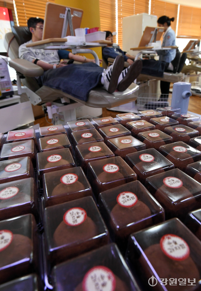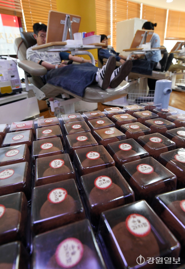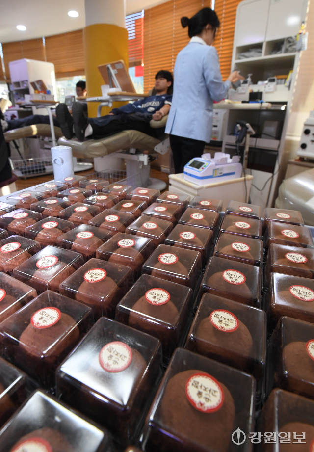 겨울철 시민들의 헌혈참여를 독려하기 위해 각 지역별 헌혈의집에서 최근 유행하는 '두쫀쿠(두바이쫀득쿠키)'를 헌혈 기념품으로 제공하는 깜짝 행사를 열고 있는 가운데 29일 춘천시 명동 헌혈의집에 헌혈자들에게 제공 할 '두쫀쿠'가 비치돼 있다.