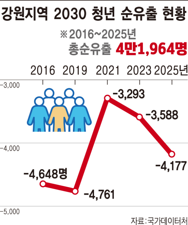 특히 청년층 유출이 심화되고 있다. 지난해 20~39세 인구 4,177명이 지역을 떠났다. 3년 전인 2022년 1,347명보다 3배 넘게 늘어난 규모다. 2016년 부터 2025년까지 고향을 떠난 청년층은 4만2,000명에 달한다.