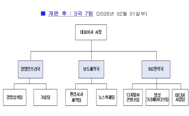 김종원 뉴스룸 보도제작팀장이 경영인프라국장 겸 기술팀장으로 임명됐다. 황병훈 편성제작국장이 보도제작국장 직무대리 겸 편성시사제작팀장으로 선임됐으며, 심준용 미디어사업국장이 BIZ전략국장을 맡았다.