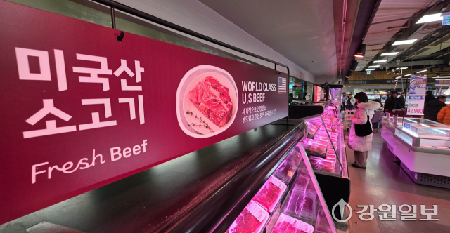미국산 냉장 척아이롤은 100g 당 3,853원으로 평년 대비 20.8%가 급등했다. 사진은 1일 도내 대형마트 미국산 소고기 매대.