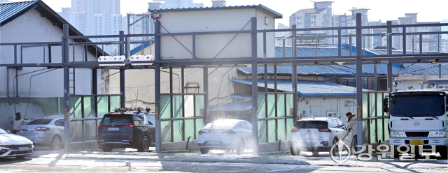 낮 최고 기온이 영상으로 올라가며 비교적 포근한 날씨를 보인 1일 춘천시내 한 세차장이 미뤄왔던 세차를 하려는 사람들로 북적이고 있다.