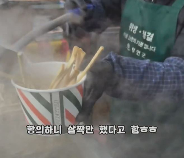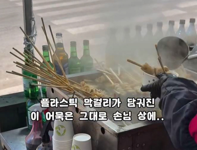 해당 유튜버는 "한 테이블 손님이 막걸리가 얼었다고 하니 사장님이 꽁꽁 얼어있는 플라스틱 막걸리병을 그대로 어묵탕 솥에 푹 담가버리셨다"면서 "심지어 5분 만에 두 병이나 담그는 것을 목격했다"고 전했다.