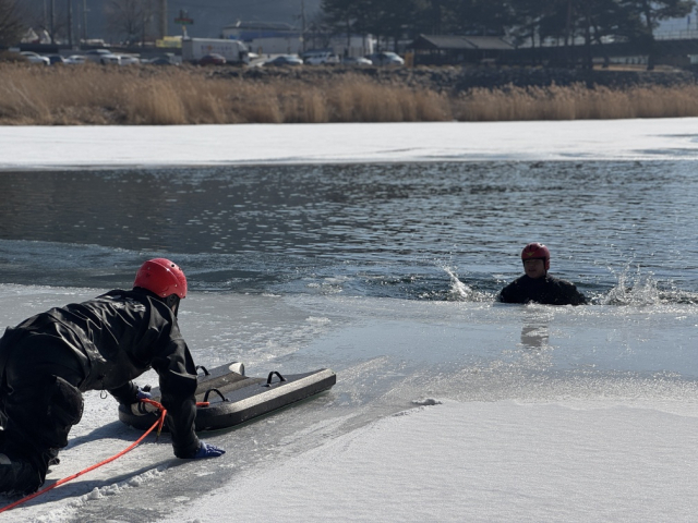 정선소방서(서장:이광섭)가 3일 정선읍 조양강 일원에서 소방대원 등 20여명이 참여한 가운데 해빙기 수난사고를 대비한 수난구조 훈련을 실시했다. 이날 소방대원들은 익수자의 저체온증 대처 및 응급처치, 빙상 구조 장비를 활용한 인명 구조 훈련 등을 실습했다.정선소방서(서장:이광섭)가 3일 정선읍 조양강 일원에서 소방대원 등 20여명이 참여한 가운데 해빙기 수난사고를 대비한 수난구조 훈련을 실시했다. 이날 소방대원들은 익수자의 저체온증 대처 및 응급처치, 빙상 구조 장비를 활용한 인명 구조 훈련 등을 실습했다.