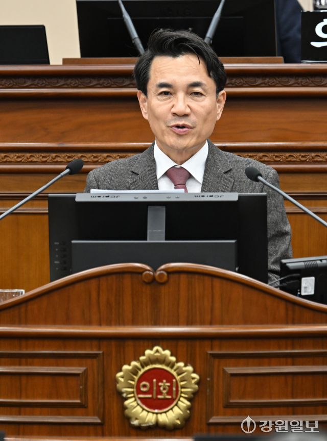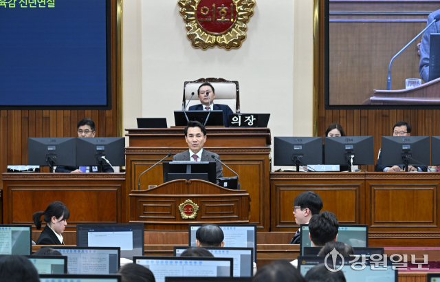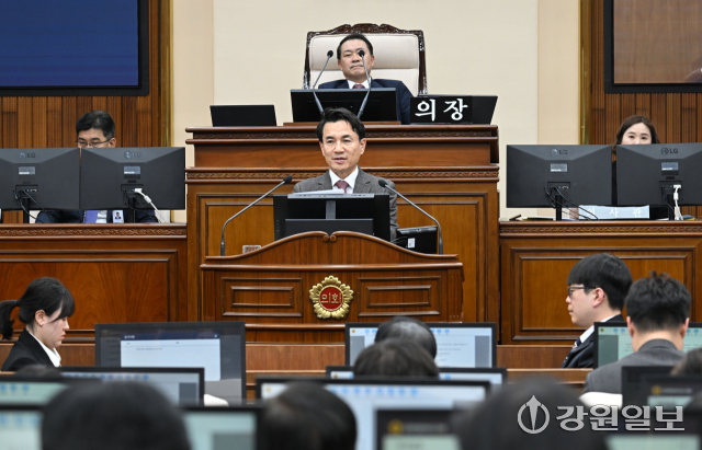 ◇3일 강원특별자치도의회에서 열린 제343회 임시회 1차 본회의에서 김진태 도지사가 신년연설을 하고 있다. 박승선기자