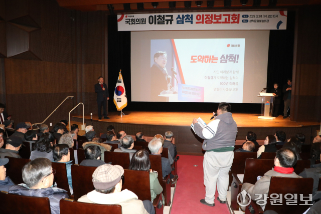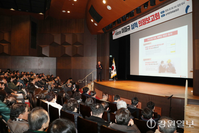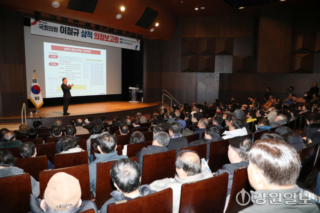 이 의원은 삼척 의정보고회에서 원전교부금 지원 확대를 비롯해 폐특법 20년 연장, 강원대 도계 오픈캠퍼스 2호관 신축, 중입자가속기를 기반으로 한 의료클러스터 등 조기 폐광지역 경제진흥사업, 수소산업 및 ESS 화재안전 검증센터, CCUS 진흥센터 구축, 장호항 어촌신활력증진사업 등의 성과를 공유했다.