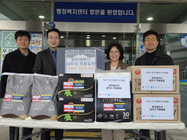 춘천세무서(서장: 강찬호)는 4일 설 명절을 앞두고 춘천시 약사명동 행정복지센터(동장: 최지현)를 방문해 성금과 쌀, 휴지 등 생필품(120만원 상당)을 전달했다.