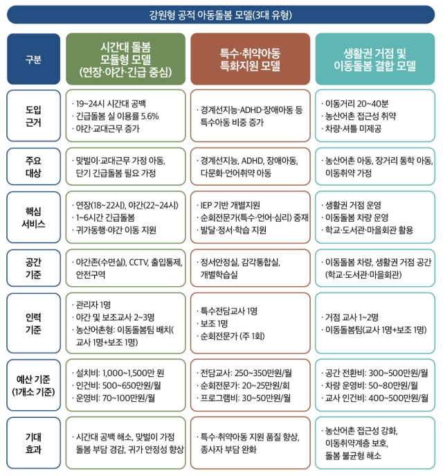 이보영 책임연구원은 “시간과 대상, 생활권별 특성을 반영한 3대 강원형 돌봄 모델을 단계적으로 도입, 확산함으로써 아동과 가족이 어디서나 안전하고 공평한 돌봄을 누리는 강원자치도를 구현하는 것이 이번 연구의 목표”라고 설명했다.