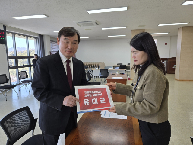 유대균 전 장학관은 9일 강원도선거관리위원회를 찾아 예비후보로 등록했다. 앞서 유 예비후보와 조 회장은 유튜브 채널인 고성국TV를 통해 지난 1일 정책토론회를 거쳐 5~7일 여론조사를 진행했다. 여론조사 결과는 양측의 합의에 따라 비공개로 결정했다.