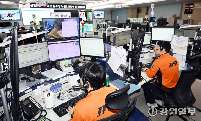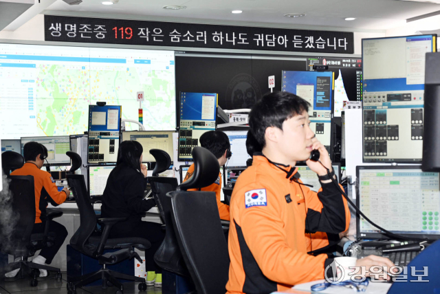 10일 오전 10시께 강원도소방본부 119종합상황실. 도민의 생명을 지키는 최전선인 이곳은 흡사 전쟁터를 방불케 했다. 신고·생활·구급·구조·화재 등 5개 단계로 구분된 경광봉이 쉴 새 없이 돌아갔고, 상황실 LED 스크린은 실시간 현장 출동 영상으로 가득찼다.