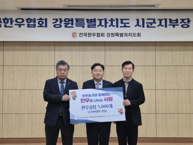 강원한우(대표이사:지정민)와 전국한우협회 강원특별자치도지회(회장:박영철)는 10일 농업인 단체회관 3층에서 설명절 맞이 ‘사랑의 한우곰탕 나눔 행사’를 열고 한우곰탕 5,000개(2,000만원)를 기부했다. 전달된 사골곰탕은 강원특별자치도 사회복지협의회(회장:박승용)를 통해 도내 18개 시·군에 전달됐다.