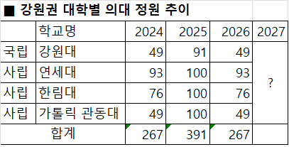 강원권 4개 의대(강원대, 연세대 미래캠퍼스, 한림대, 가톨릭관동대) 정원도 2027학년도에는 79명이 늘어난 350여명으로 증가 될 전망이다.