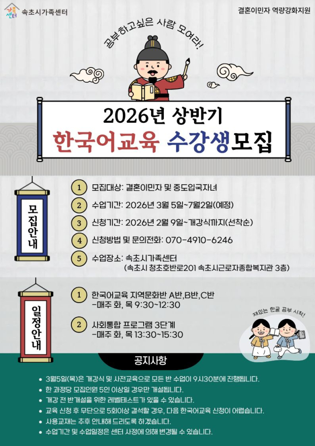 【속초】속초시가족센터는 지역에 거주하는 결혼이민자의 지역사회 정착과 자립을 돕기 위해 상반기 한국어교육과 운전면허 취득 지원사업 참여자를 모집한다.