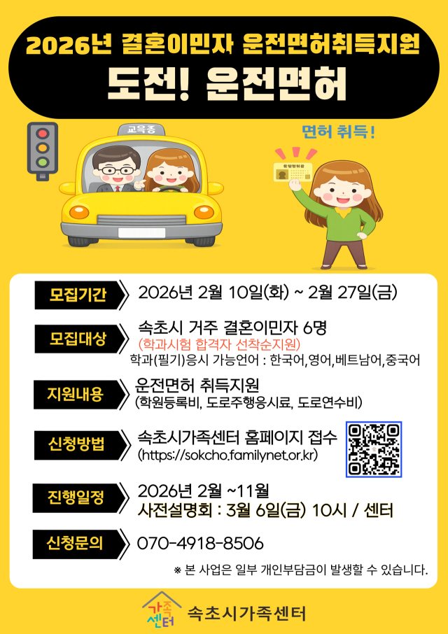 배영란 속초시가족센터장은 “한국어교육은 단순한 언어 학습을 넘어 지역사회 구성원으로서 자립할 수 있는 기반을 마련하는데 의미가 있다”며 “운전면허 취득 지원 사업을 통해서는 취업기회 확대는 물론 일상생활의 편의성과 삶의 만족도 향상에도 도움이 되길 기대한다”고 말했다.