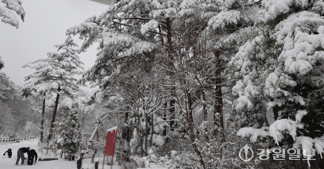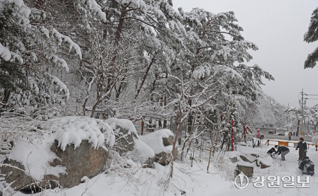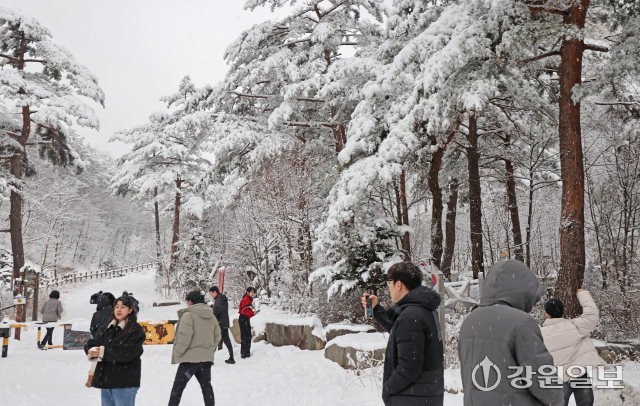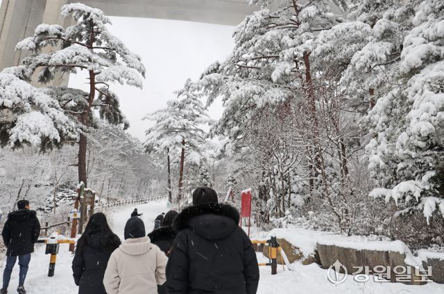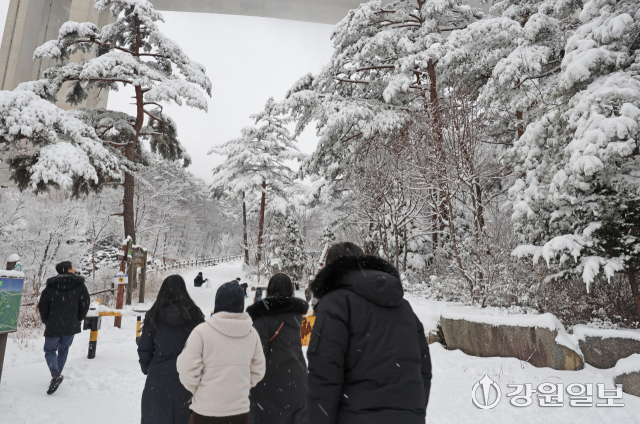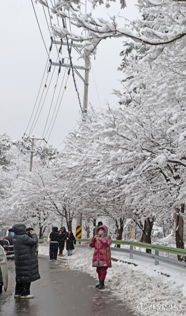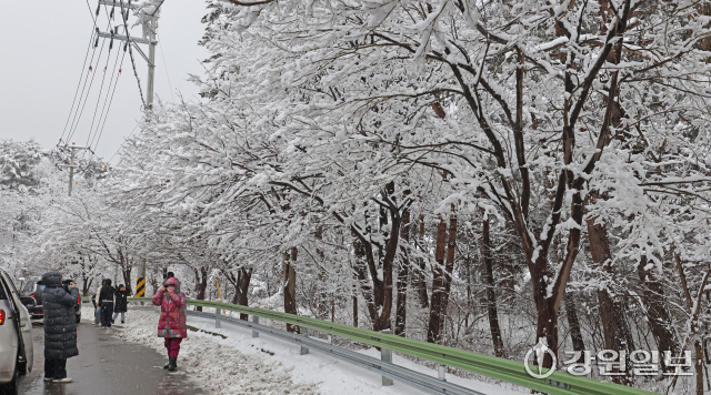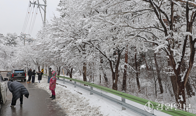 메마른 동해안 지역에 10cm 안팎의 많은 눈이 내린 지난 16일 강릉시 성산면 옛영동고속도로 주변에 설경이 펼쳐져 귀성객들이 추억을 남기고 있다. 대설특보가 발효된 동해안과 산지에 시간당 1~3㎝, 최대 10㎝의 눈이 내려 대부분 지역에 내려진 건조특보가 53일만에 해제됐다 강릉=권태명기자