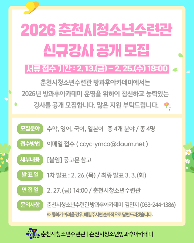 춘천시청소년수련관이 오는 25일까지 ‘2026년 춘천시청소년수련관 신규강사’를 공개 모집한다.