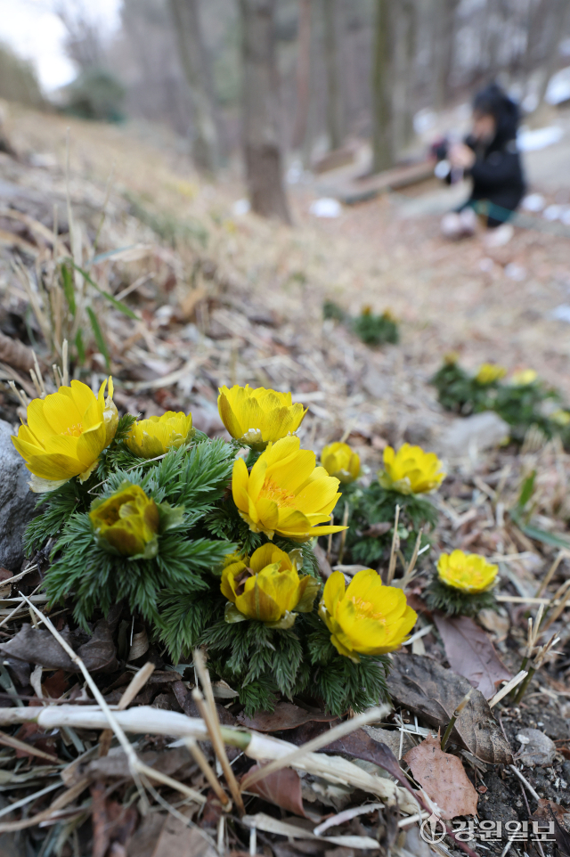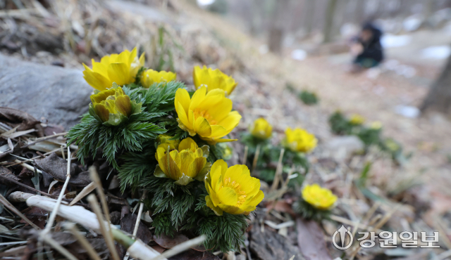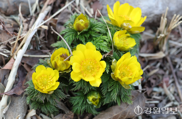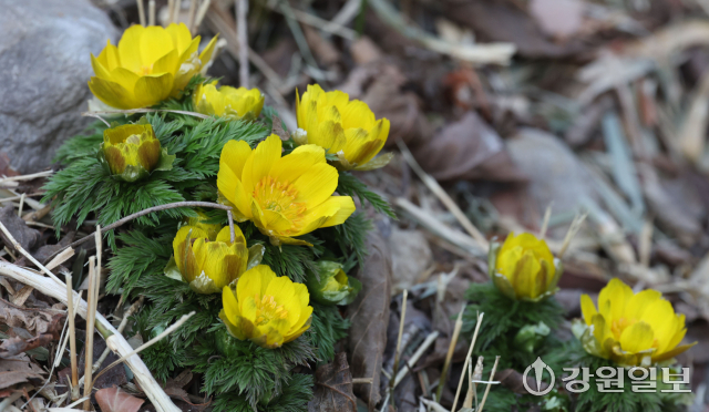 절기상 우수(雨水)인 19일 강릉시 외곽 야산에 봄의 전령사로 불리우는 복수초가 노란 꽃망울을 틔우며 봄 소식을 전하고 있다. 강릉=권태명기자