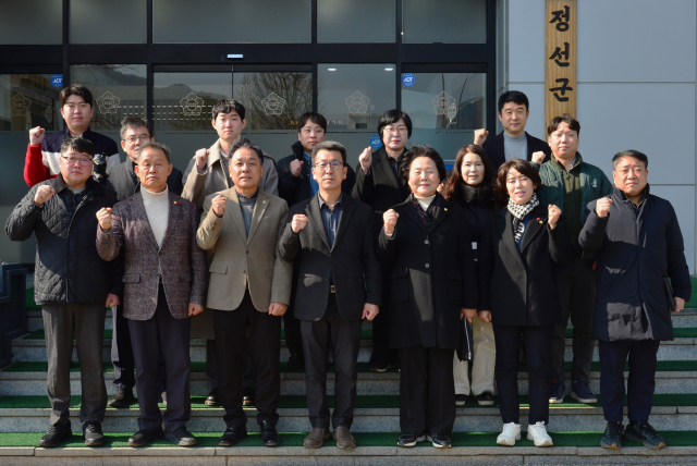 정선군의회가 지난 20일 정선군의회 앞에서 전영기 정선군의장을 비롯한 송수옥 정선군의회 부의장 등 의원 전원과 의회 사무과 직원들이 참석한 가운데 제27회 정선군민건강달리기대회 참가 및 완주를 다짐하며 화이팅을 외치고 있다.