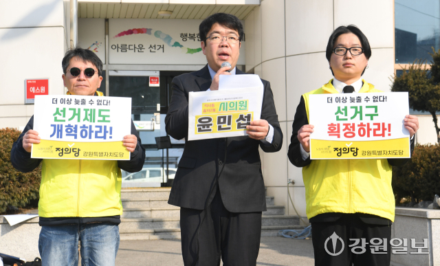 정의당 강원자치도당은 20일 춘천시선거관리위원회에서 윤민섭 위원장 등이 참석한 가운데 기자회견을 열고 '6.3 지방선거' 선거구 획정을 촉구했다. 이날 기자회견을 마친 윤 위원장은 춘천시의원 예비후보에 등록했다.