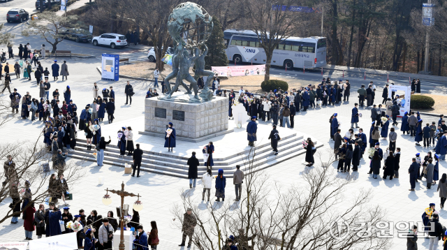 20일 졸업식이 열린 강원대 춘천캠퍼스 미래광장 일대가 미래창조상을 배경으로 기념사진을 남기려는 졸업생과 가족들로 장사진을 이루고 있다.
