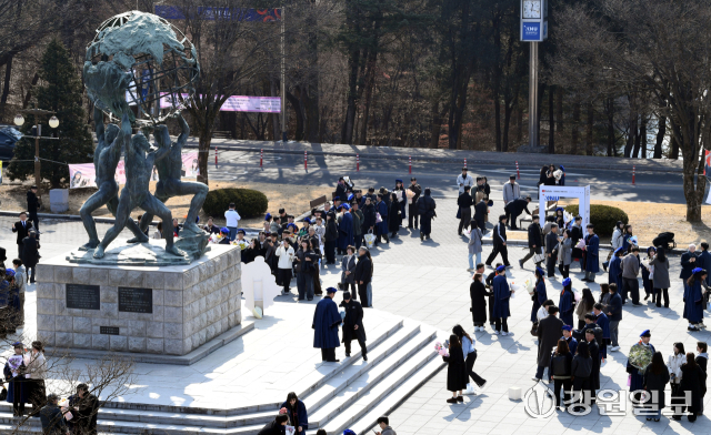 20일 졸업식이 열린 강원대 춘천캠퍼스 미래광장 일대가 미래창조상을 배경으로 기념사진을 남기려는 졸업생과 가족들로 장사진을 이루고 있다. 박승선기자