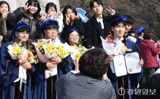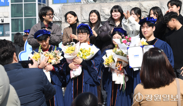 20일 졸업식이 열린 강원대 춘천캠퍼스 미래광장에서 졸업생들이 친구, 가족들과 기념사진을 남기며 기뻐하고 있다.