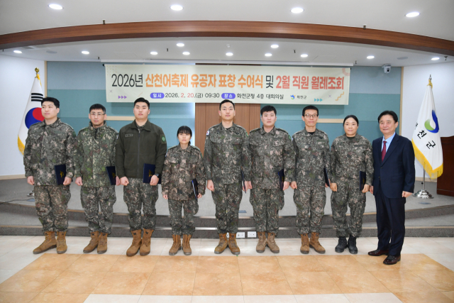 2026 화천산천어축제 유공자 표창 수여식 및 2월 월례조회가 20일 화천군청에서 최문순 군수, 안중기 부군수를 비롯한 축제 종사자, 군부대 관계자, 군청 전 직원들이 참석한 가운데 열렸다.2026 화천산천어축제 유공자 표창 수여식 및 2월 월례조회가 20일 화천군청에서 최문순 군수, 안중기 부군수를 비롯한 축제 종사자, 군부대 관계자, 군청 전 직원들이 참석한 가운데 열렸다.