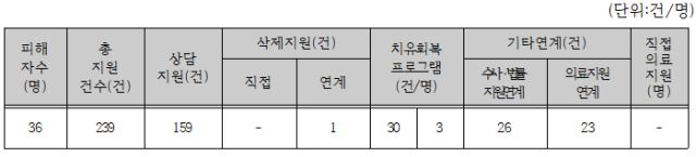 지난해 두 명의 상담원이 진행한 피해자 지원은 239건. 신속한 개입으로 유포와 확산을 막아야 하는 디지털성폭력은 그야 말로 시간과의 싸움이다. 센터에 피해가 접수되면, 상담원들은 영상물 유포 여부 등을 확인한 뒤 곧바로 초기 상담에 나선다. 이후 신고와 삭제지원이 이뤄지며, 이 과정서 상담원들은 파해자들에 신뢰관계인으로 동석해 지원을 이어간다. 이후 의료·법률 지원과 지속적인 모니터링이 진행된다. 피해자가 일상을 회복하기 까지 짧게는 수 개월, 길게는 수 년이 걸린다.