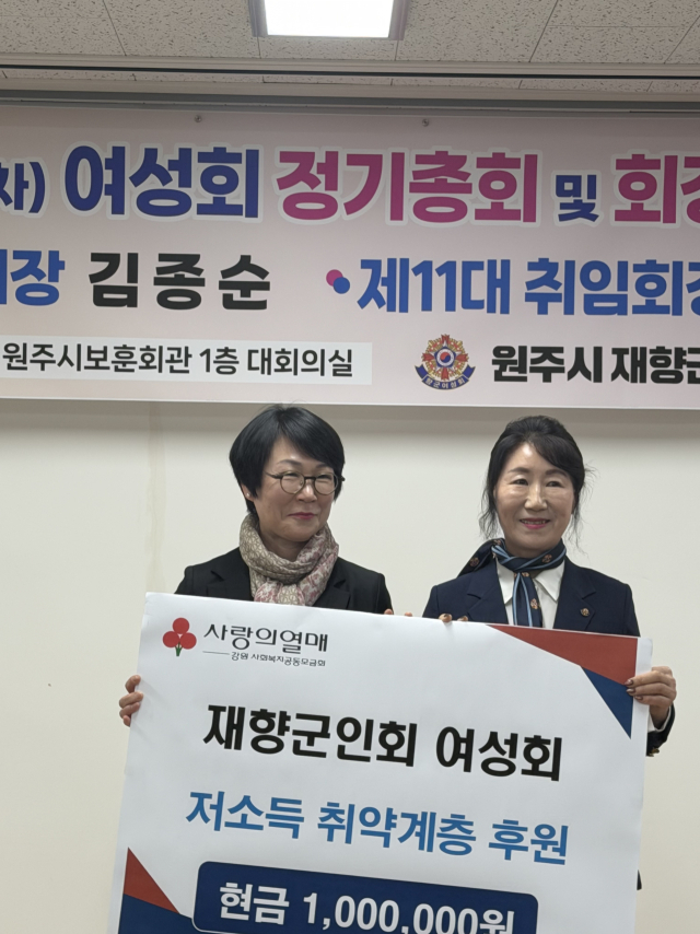 원주시재향군인회 여성회(회장:김종순)는 23일 원주시청에 방문해 지역 내 저소득 취약계층을 위한 지정기탁 후원금 100만원을 전달했다.