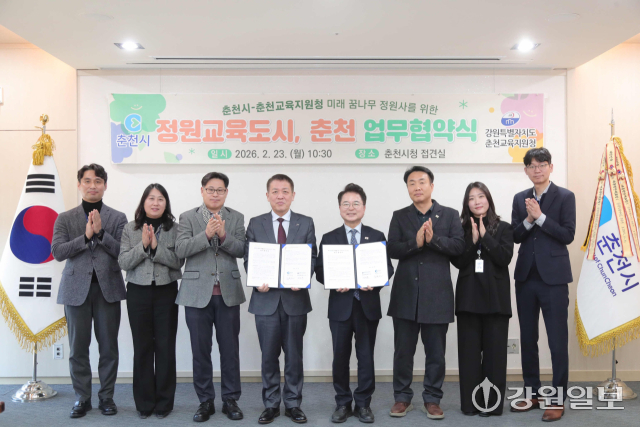 춘천시와 춘천교육지원청은 23일 시청 접견실에서 육동한 시장, 장진호 춘천교육장 등이 참석한 가운데 봄내 꿈나무 정원사 양성 및 정원문화 확산을 위한 업무협약을 맺었다. 이번 협약을 토대로 양 기관은 정원교육을 통한 호수정원도시 조성을 위해 상호 긴밀한 협력 체계를 구축해나간다.