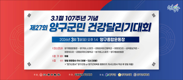 【양구】다음달 1일 개최되는 강원일보사 주최 ‘제27회 양구건강달리기대회’가 올해 현장 접수 방식으로 진행되면서, 보다 많은 군민들이 부담 없이 참여할 수 있을 것으로 기대를 모으고 있다.