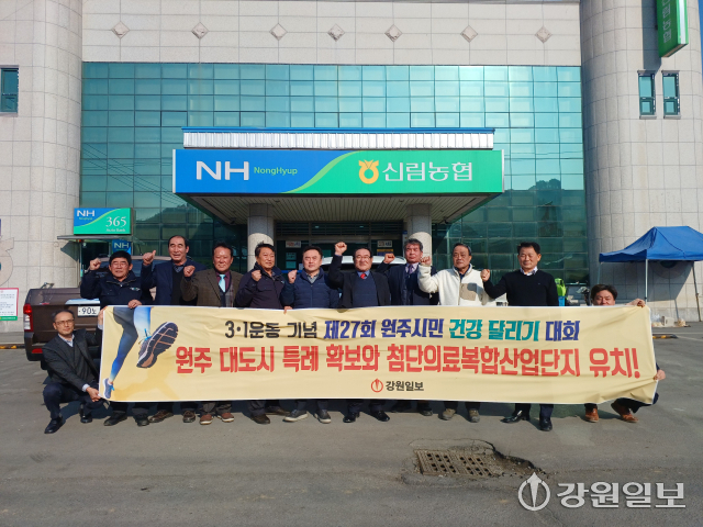 신림농협(조합장:이남영)은 24일 신림농협 앞에서 강원일보 주최 제27회 3.1절 기념 원주시민 건강달리기 대회 완주와 원주 대도시 특례 확보 및 첨단의료복합산업단지 유치를 위한 화이팅을 외쳤다.