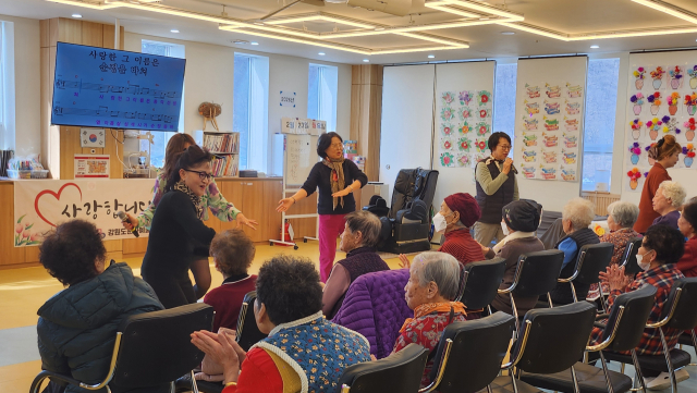 강원도문화예술인연합회 회원들과 가수 수진은 23일 홍천데이케어 재가복지센터를 찿아 어르신들을 위문 공연을 펼쳤다.