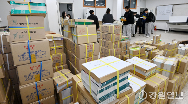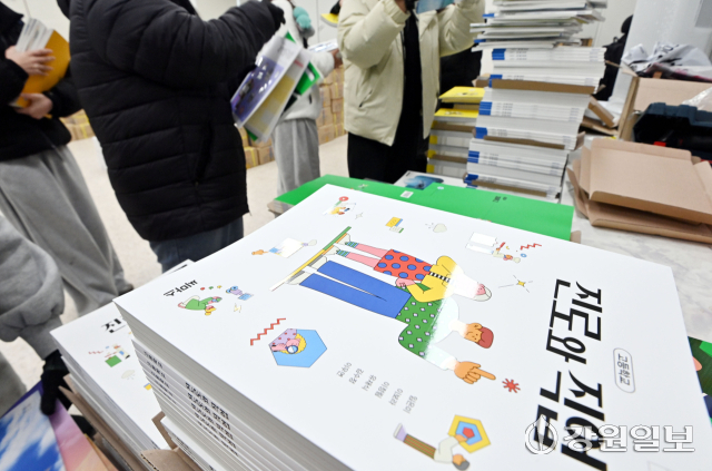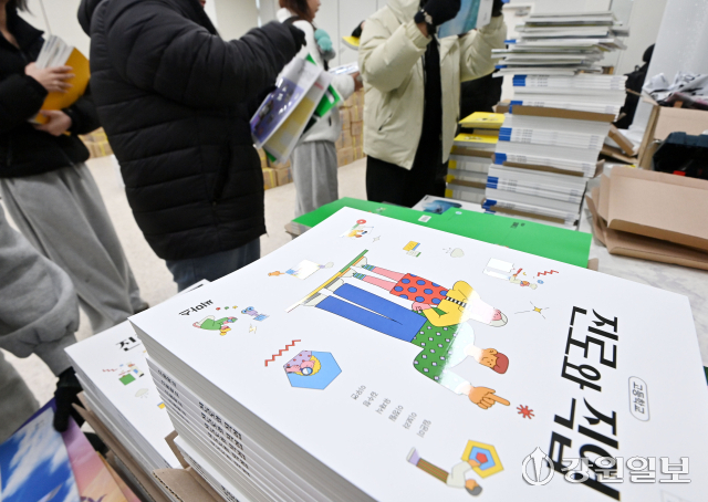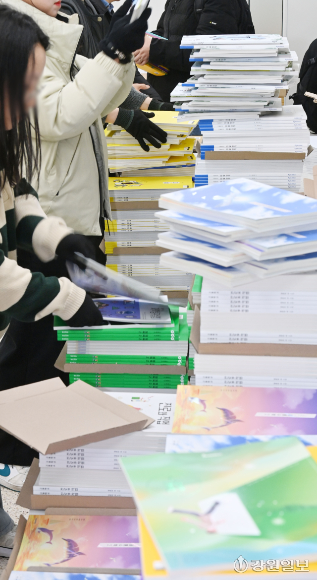 신학기를 앞둔 24일 강원대학교 사범대학 부설고등학교에서 학교 교직원들이 새 교과서 배부 작업을 하고 있다. 임도혁기자