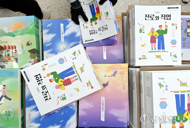 신학기를 앞둔 24일 강원대학교 사범대학 부설고등학교에서 1학년 신입생들이 새 교과서 배부 받고 있다. 임도혁기자