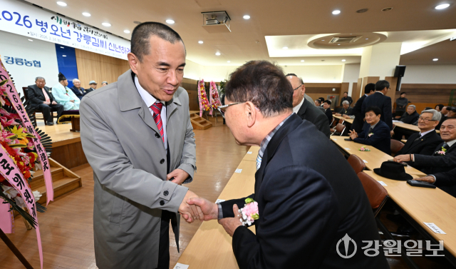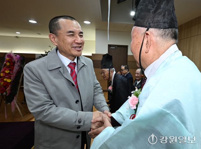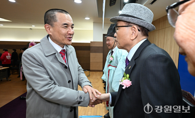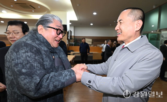 김진태 강원특별자치도지사가 24일 강릉농협 4층 대강당에서 열린 ‘2026 강릉김씨 신년하례회’를 찾아 김진선 전 지사와 대화를 나누고 있다. 강릉=권태명기자