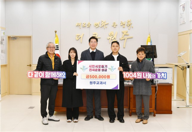 원주교과서(대표:김기봉)는 지난 23일 원주시청에서 원강수 시장 등이 참석한 가운데 천사운동 후원금 50만원을 기탁했다.