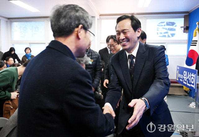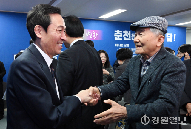 강원도지사에 출마하는 우상호 전 청와대 정무수석이 26일 춘천시 운교동에서 열린 원선희 춘천시장 예비후보 선거사무소 개소식에서 참석자들과 인사를 나누고 있다. 신세희기자