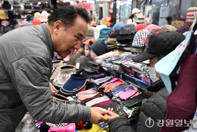 국민의힘 염동열 강원도지사 예비후보가 26일 춘천 중앙시장에서 상인들을 만나며 민심 청취를 하고 있다. 신세희기자
