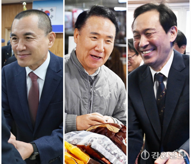 6·3 지방선거를 앞두고 26일 강원특별자치도 도지사 출마 후보군들이 유권자들과 인사하고 있다. 사진 왼쪽부터 김진태 지사, 국민의힘 염동열 예비후보, 우상호 전 청와대 정무수석. 순서는 가나다 순이다.