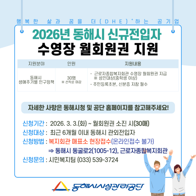 【동해】동해시시설관리공단은 동해시 신규 전입자의 안정적인 지역 정착을 지원하기 위해 생활밀착형 복지서비스의 일환으로 근로자복지회관 수영장의 월회원권 지원사업을 추진한다.