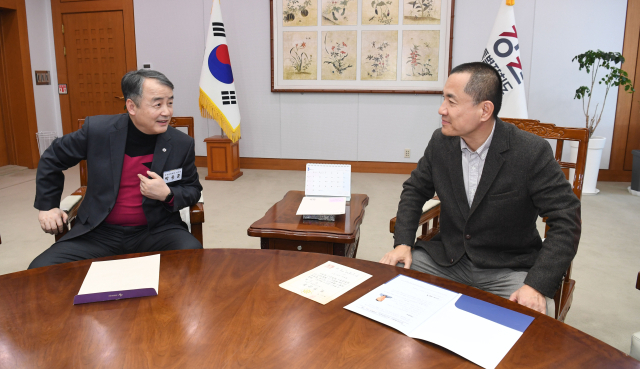 박종훈 춘천문화재단 이사장이 3일 강원특별자치도청을 찾아 김진태 도지사에 ‘인재육성기금’을 기탁했다.