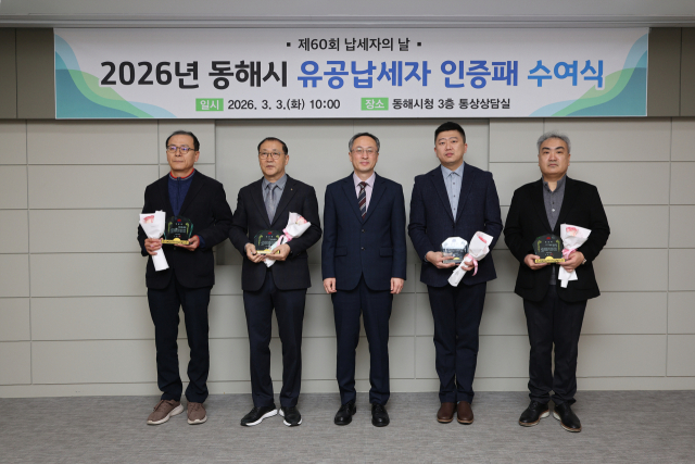 인증패 전달 대상자는 최근 3년간 지방세를 성실히 납부하며 지역 발전에 기여한 유공납세자는 류종광씨와 남상진씨 등 개인 2명과 근로복지공단 동해병원, 묵호농협, ㈜맑은 동해 등 법인 3곳이다.