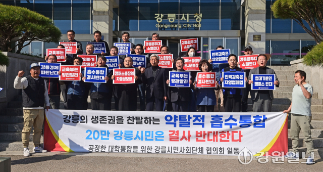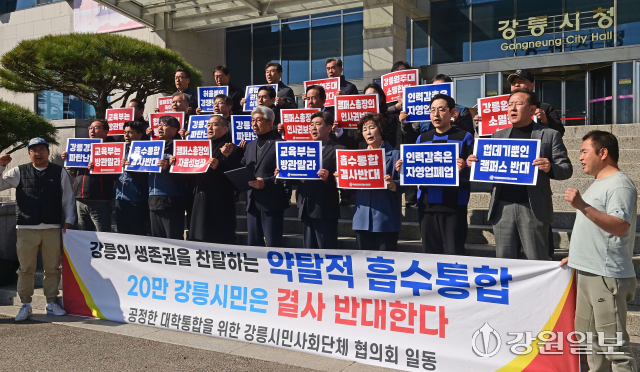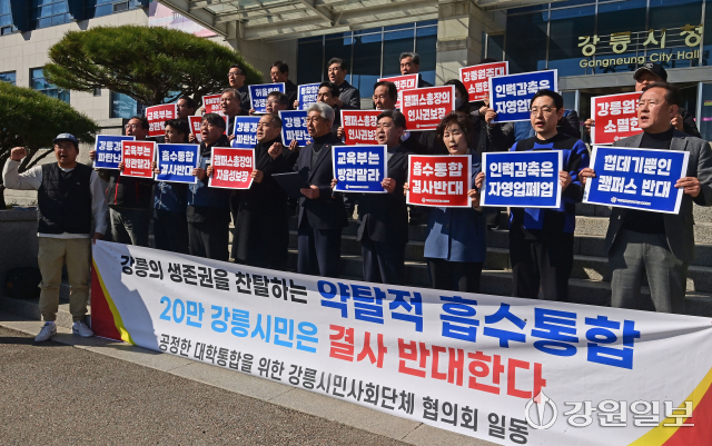 공정한 대학 통합을 위한 강릉시민사회단체협의회는 4일 강릉시청 앞에서 기자회견을 열고 "강원대 통합 출범은 대등한 결합이 아닌 일방적인 약탈"이라며 "강릉의 교육 주권을 춘천에 빼앗길 수 없다"고 밝혔다. 강릉=권태명기자