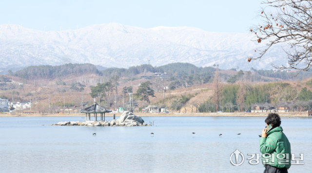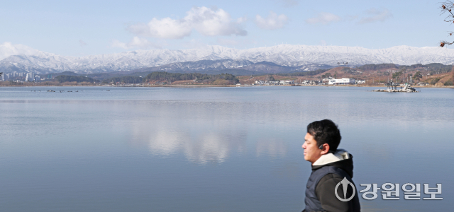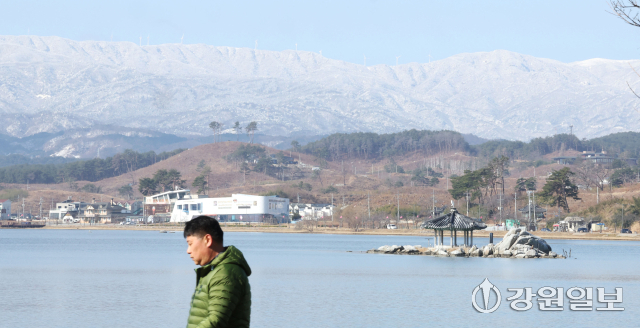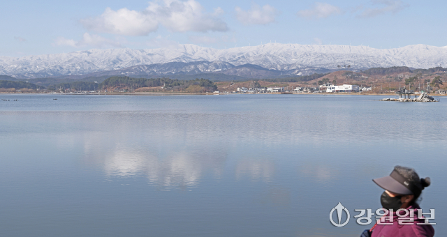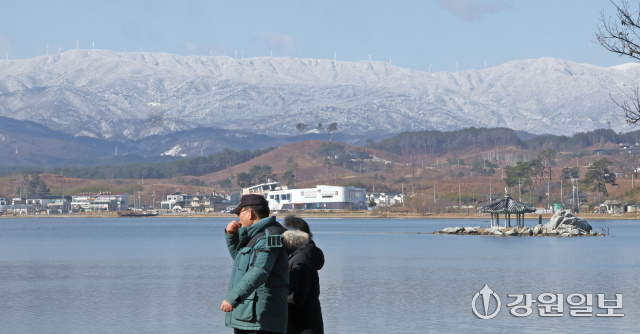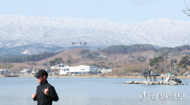 절기상 경칩(驚蟄)을 하루 앞둔 4일 강릉 경포호에서 바라본 백두대간이 전날 내린 폭설로 장관을 연출하고 있다. 강릉=권태명기자