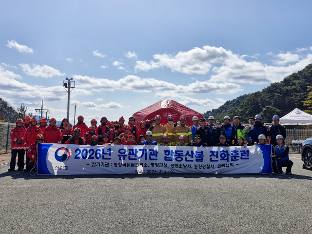 【평창】산림청 평창국유림관리소(소장:이명규)는 4일 평창읍 주진리 한국전력공사 주진변전소 일원에서 산림청, 소방, 경찰, 평창군, 한국전력공사 등 유관기관이 참여한 ‘2026년 유관기관 합동 산불진화훈련’을 실시했다.