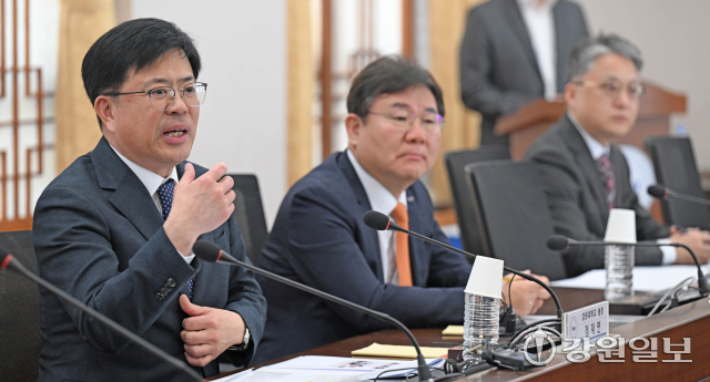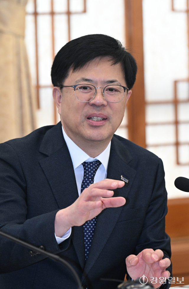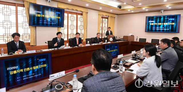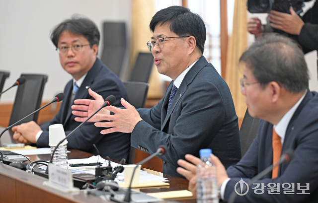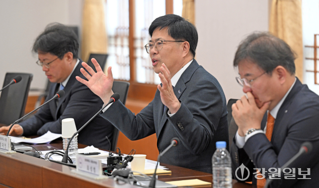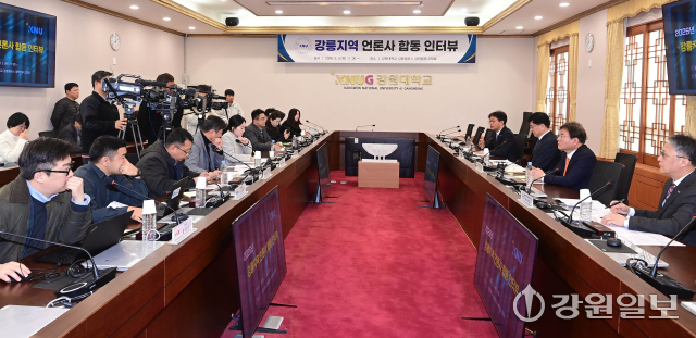 정재연 강원대 총장이 5일 강릉캠퍼스에서 열린 기자간담회에서 통합 관련 입장을 밝히고 있다. 강릉=권태명기자